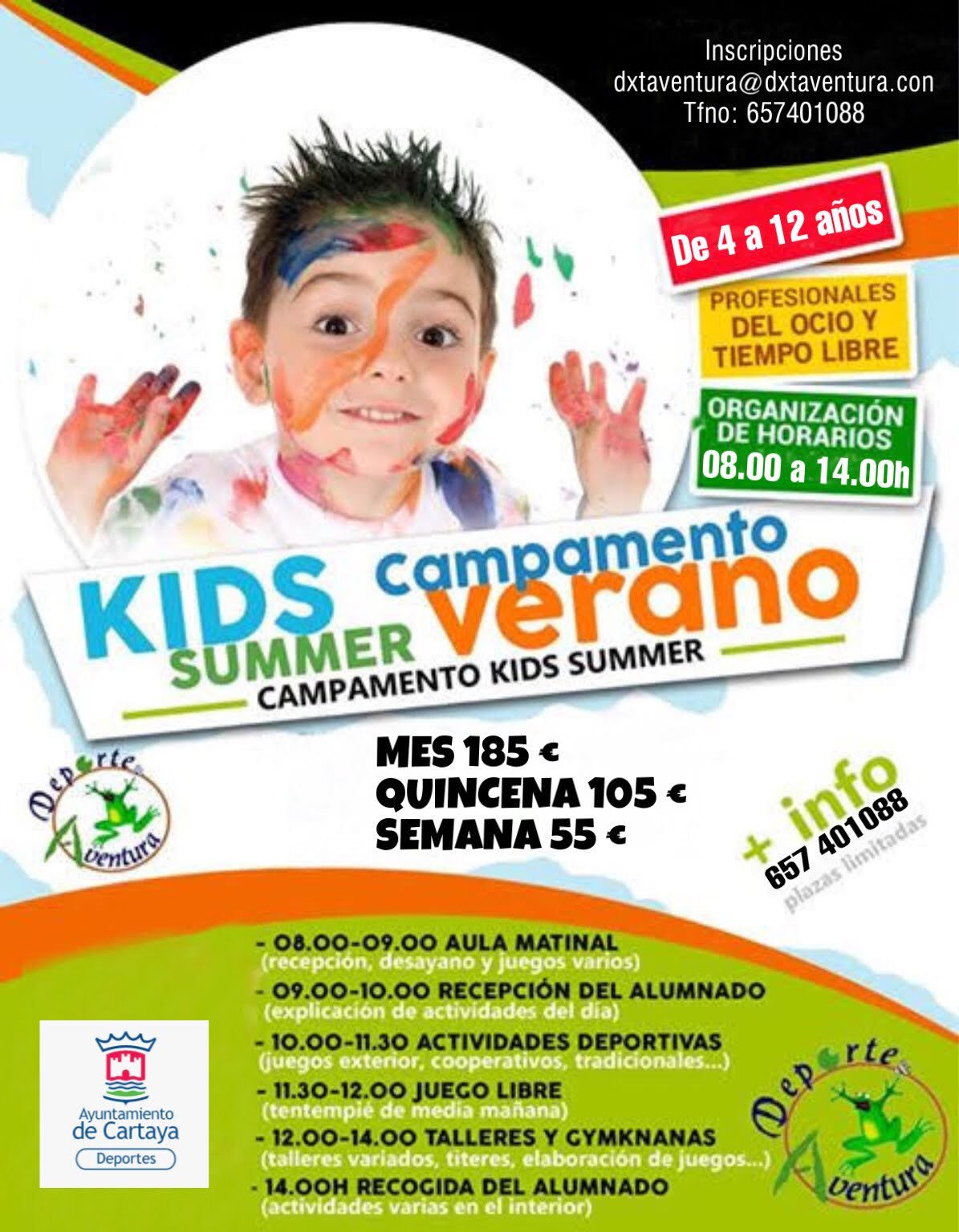 El Área de Deportes del Ayuntamiento de Cartaya informa de la puesta en marcha este verano del Campus Deportivo DXT& AVENTURA S.L., que se pone en marcha a partir del 1 de julio, en las instalaciones del Complejo Deportivo municipal, “para facilitar el que las familias puedan compaginar la vida laboral y familiar durante el verano, y también para promover el deporte y otras actividades creativas entre los menores”.