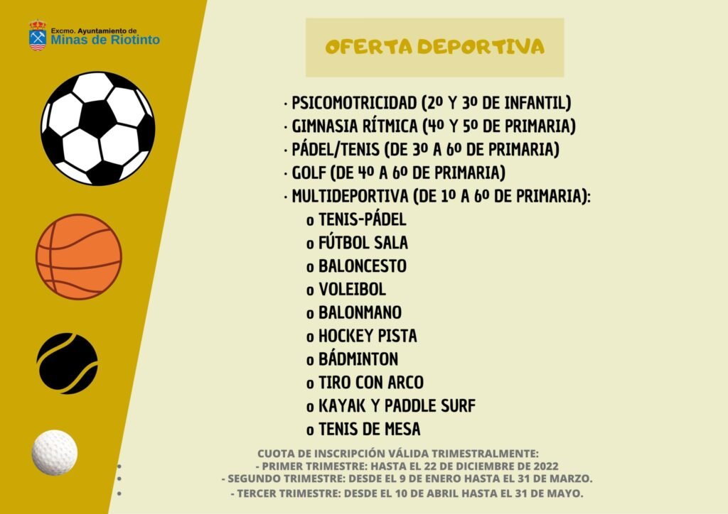 En la mañana de este jueves se ha repartido toda la información entre las diferentes aulas del CEIP ‘Virgen del Rosario’, para que los pequeños puedan barajar la diversa oferta deportiva que ha confeccionado el consistorio. La principal novedad es la recuperación de las clases de tenis, un deporte del que también Riotinto es Cuna. El plazo de inscripción estará abierto hasta el lunes 3 de octubre.