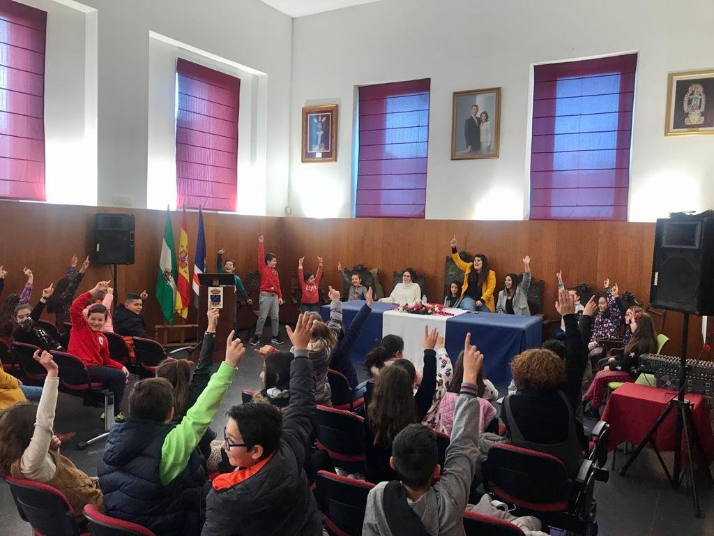 Los alumnos de 3º y 4º de Primaria del CEIP Virgen del Rosario de Minas de Riotinto han visitado el Ayuntamiento de la localidad para conocer ‘in situ’ cómo funciona el Consistorio, para lo que han escuchado las explicaciones de la alcaldesa y le han trasladado una serie de preguntas que ya traían preparadas de clase.