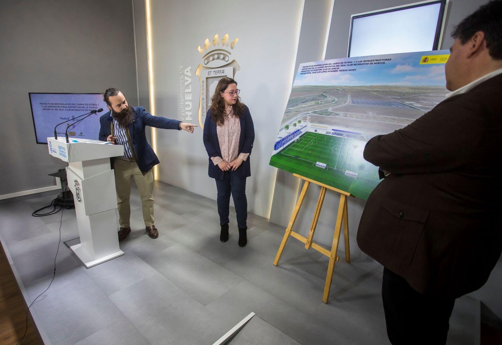 El alcalde de Huelva, Gabriel Cruz, acompañado de la presidenta del Sporting de Huelva, Manuela Romero; y del presidente del Recreativo de Huelva, José Antonio Sotomayor, ha anunciado este juves el comienzo de la obras de remodelación del campo 1 de la Ciudad Deportiva del Recreativo.