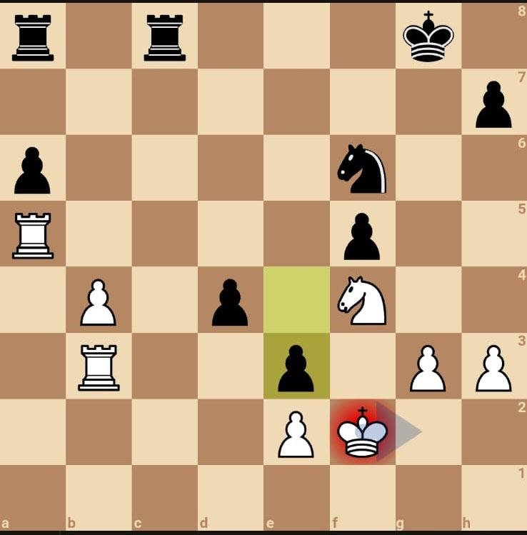 A partir de ahí el ajedrecista sueco «continuó con un juego muy pasivo, sin mucha ambición», tras lo que, en la jugada 39, llega el tercer momento clave de la partida. Arvin Rasti juega e3+ (posición de la imagen principal que ilustra el artículo), lo que es entendido por el maestro FIDE cordobés como un error, ya que su rival «compromete su estructura de peones», lo que permite a Bernardo César «buenos chances» y comerse uno a uno los peones de ‘d’, ‘e’ y ‘f’.