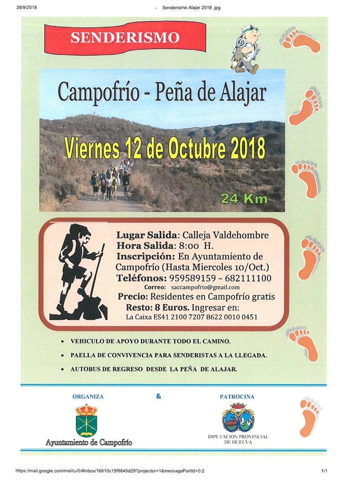 La actividad es gratuita para todos los residentes en Campofrío y tiene un precio de ocho euros para el resto de personas. Los participantes podrán además disfrutar de una paella de convivencia al finalizar el senderismo y tendrán a su disposición un vehículo de apoyo durante todo el recorrido y un autobús de regreso desde la Peña de Alájar. La salida tendrá lugar en la Calle Valdehombre a las 8.00 horas.