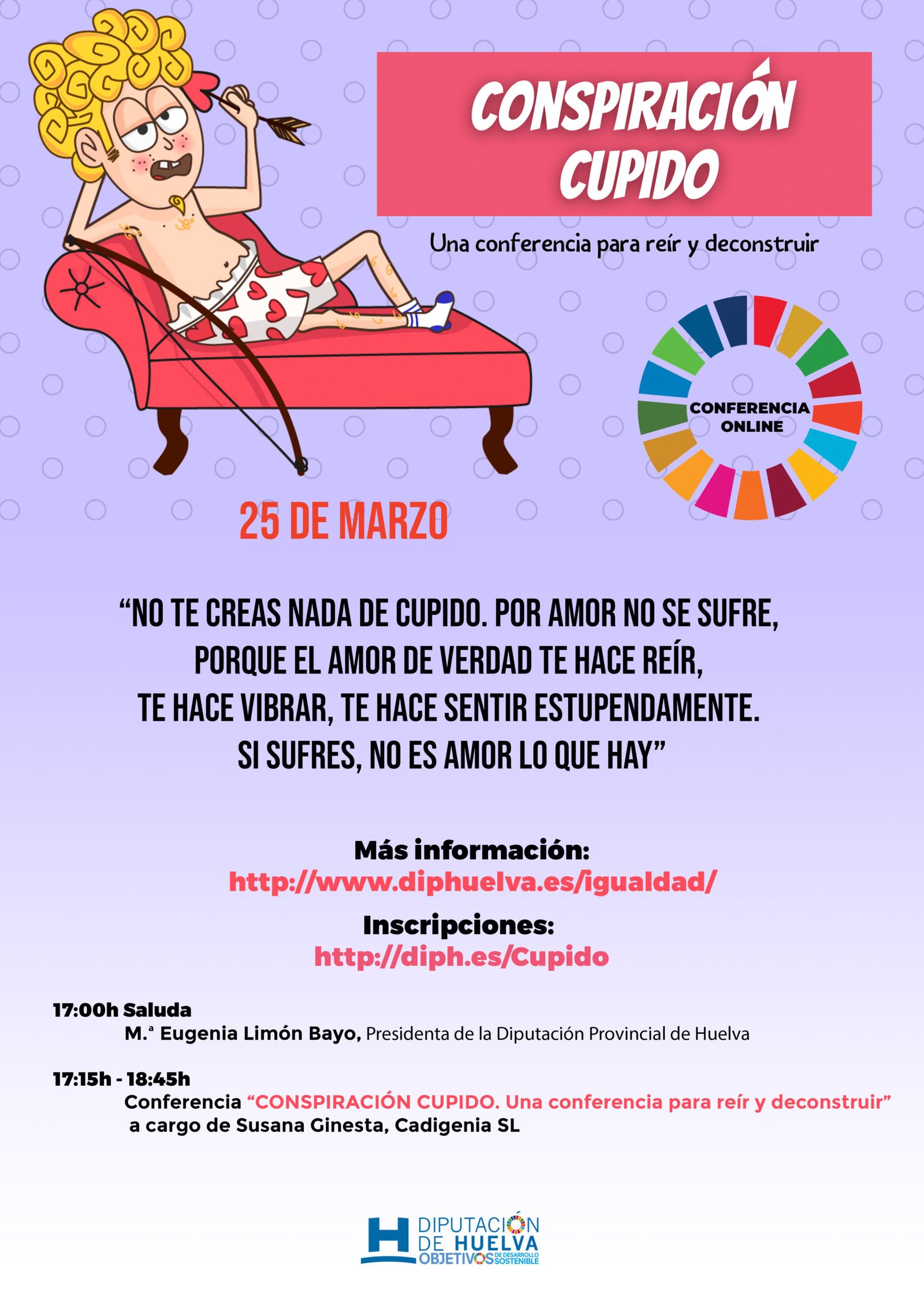 El Departamento de Igualdad de la Diputación de Huelva abrirá el próximo lunes 15 de marzo el plazo de inscripción en la conferencia online “Conspiración Cupido. Una conferencia para reír y deconstruir”, que se desarrollará el 25 de marzo, a las 17,00 Horas.
