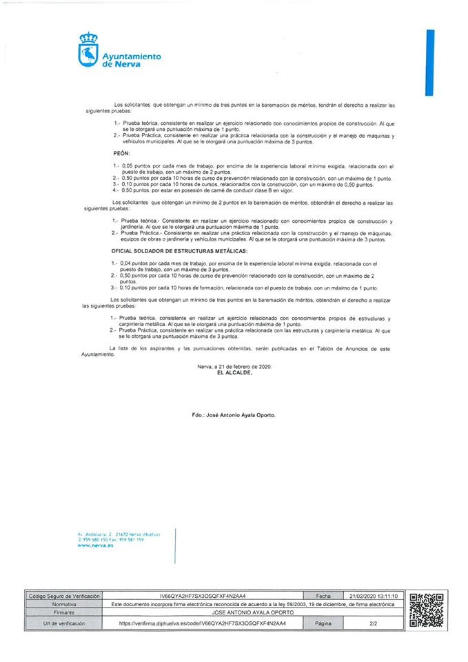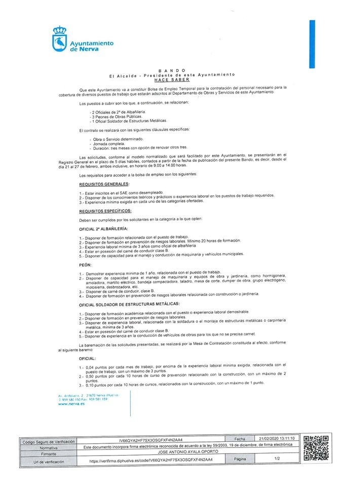 Según ha informado el alcalde del municipio, José Antonio Ayala, a través de un Bando Municipal, los puestos de trabajo a cubrir son seis: tres peones de obras públicas, dos oficiales de albañilería de segunda categoría y un oficial soldador de estructuras metálicas.