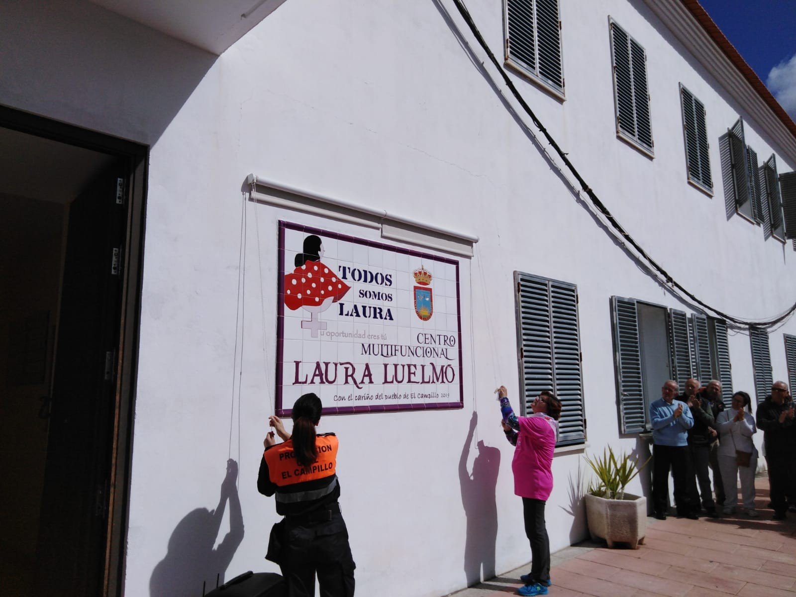 A continuación ha tenido lugar el momento más emotivo del acto, cuando se ha desvelado el rótulo de azulejos que da nombre al edificio, en el que se aprecia la famosa ilustración con la que Laura Luelmo defendió los derechos de las mujeres acompañada de su mensaje «Tu oportunidad eres tú», así como el lema con el que toda la sociedad campillera y española dieron grandes muestras de su apoyo a la joven, ‘Todos somos Laura’.