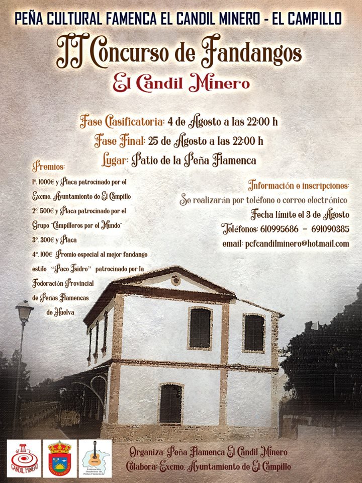 La fase clasificatoria se celebrará el 4 de agosto a las 22.00 horas en el patio de la Peña Cultural Flamenca ‘Candil Minero’ de El Campillo, mientras que la fase final tendrá lugar, a la misma hora, el día 25 en la Plaza del Ayuntamiento. La organización pondrá un guitarrista a disposición de los participantes, aunque éstos podrán acompañarse del suyo, corriendo con los gastos correspondientes.