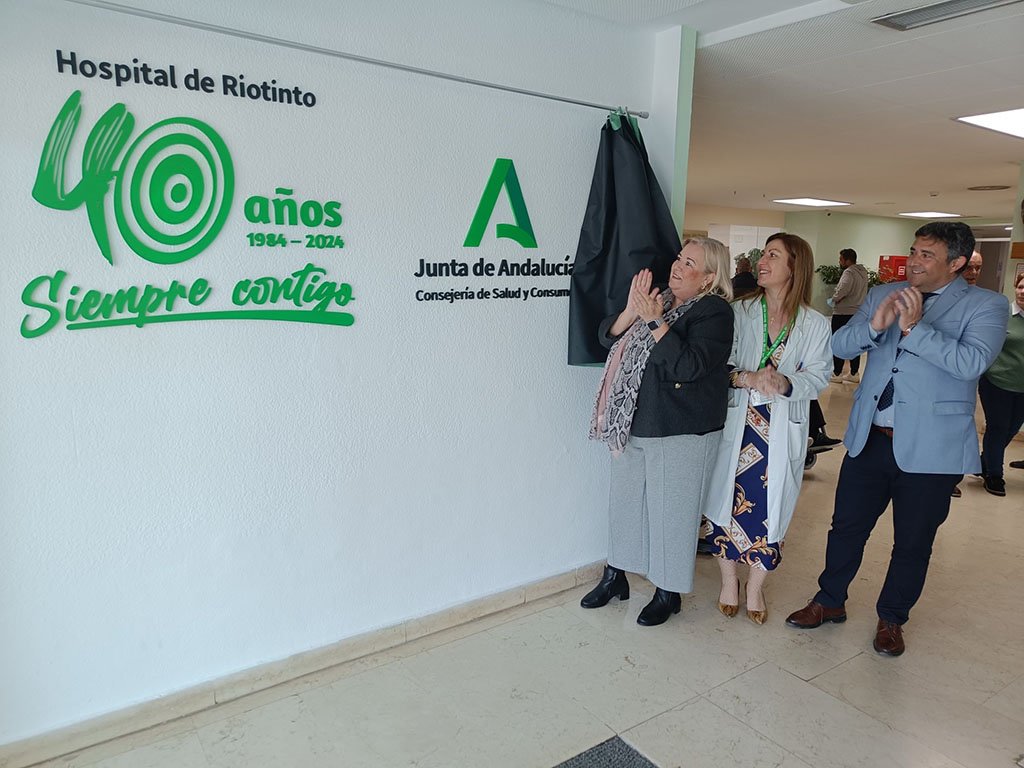 Durante la visita al centro, en la que han estado acompañados por la directora gerente del área sanitaria, María Paz Pérez, se ha aprovechado también para izar la bandera y descubrir la placa y la lona lateral conmemorativas con las que se inicia el programa de celebración este año del 40 aniversario de la apertura del Hospital de Riotinto, bajo el lema ‘Siempre contigo’. Un acto al que se ha sumado una nutrida representación de alcaldes de la zona de influencia del centro.
