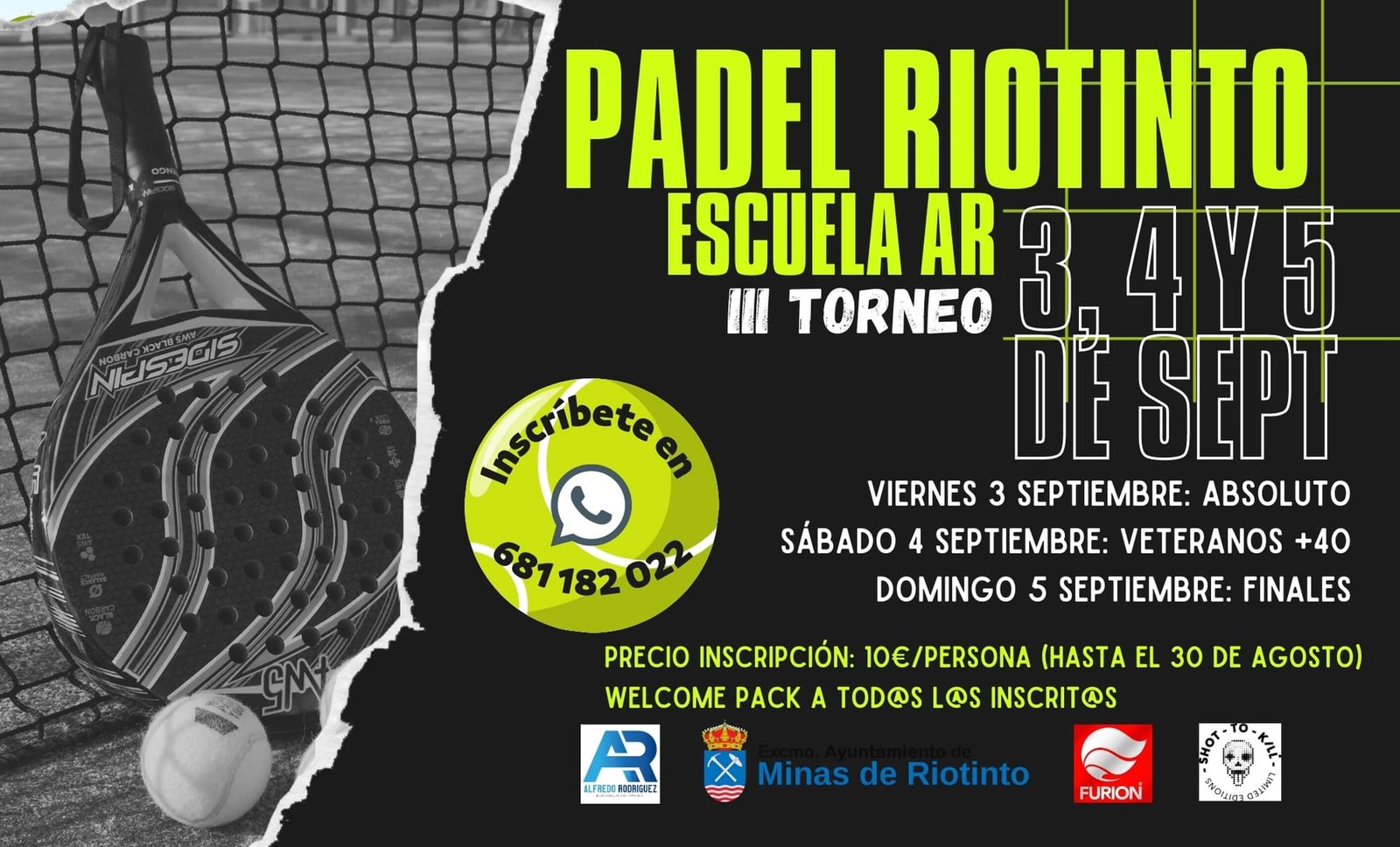 La ciudad de Minas de Riotinto acogerán los días 3, 4 y 5 de septiembre el III Torneo de Pádel Escuela Alfredo Rodríguez que se celebrará en el polideportivo municipal.