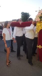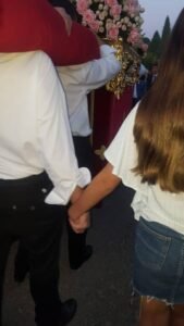 – Por motivos laborales no he podido acompañar a La Esquila como hubiese querido y como acostumbraba a hacerlo, es decir, todos los días de principio a fin, pero los escasos ratos en los que he estado han sido disfrutados, te lo aseguro. A pesar de ello, ha habido muchos momentos especiales, cada uno de ellos con su importancia para mí, y destacar alguno sería difícil. La Esquila en mi casa y mi pequeña conmigo escuchándola, el reencuentro con los amigos de siempre cuando vamos todos a una voz, el poder llevar a la Virgen junto a mis compañer@s, el poder hacerlo con mi hija en brazos, el coro cantando la salve…. Y ver a mi amigo Agustín Ruiz bajo ‘el palo’ con su camisa blanca, demostrándonos que no siempre la historia se repite, que la lucha también puede obtener recompensa… uuuufff. Siempre le agradeceré ésto a nuestra Madre del Rosario.